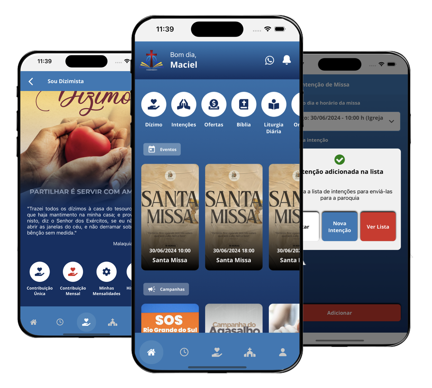 Permita que sua comunidade envie múltiplas intenções para a Santa Missa, acompanhe a programação da paróquia, leia a liturgia diária e faça a entrega do dízimo com apenas um clique.