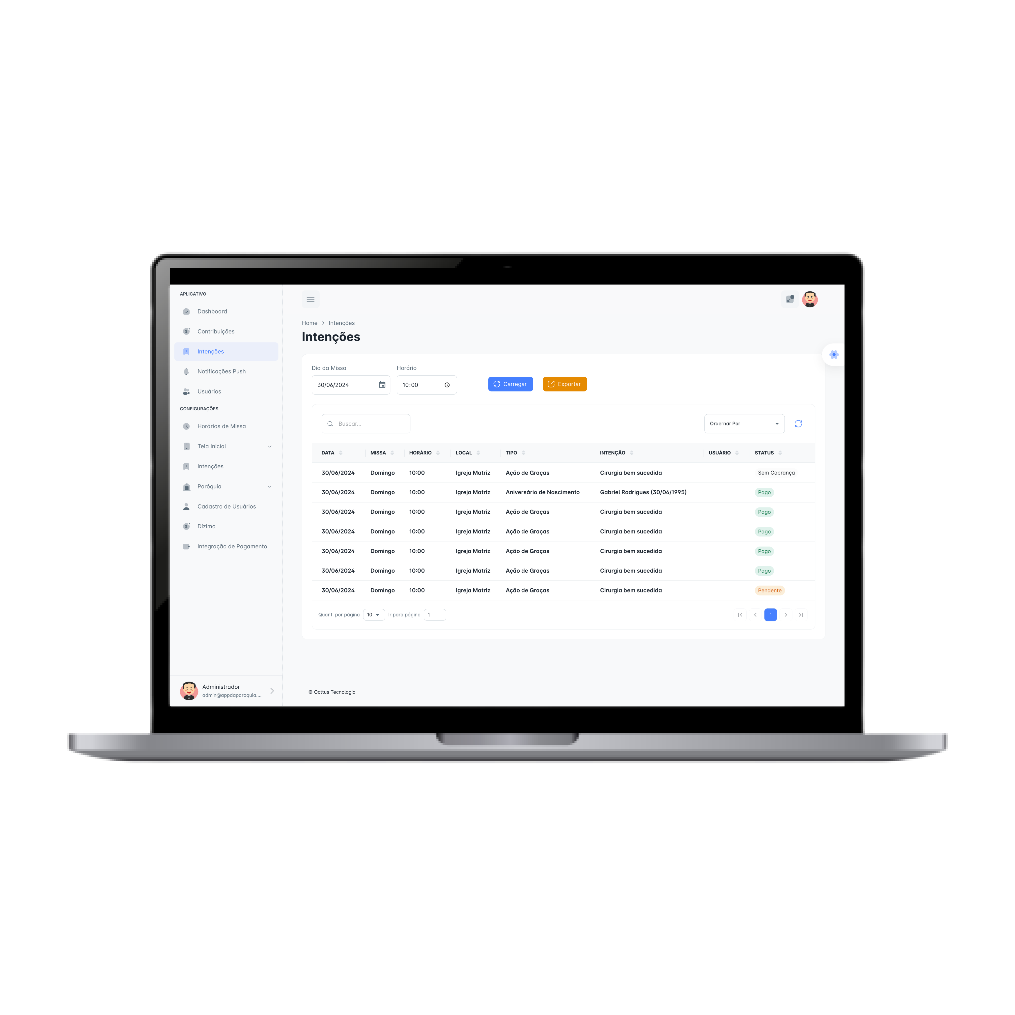 A paróquia terá total controle sobre as intenções de missa cadastradas pelos fiéis. A plataforma permite a exportação das intenções para serem lidas durante a Santa Missa.