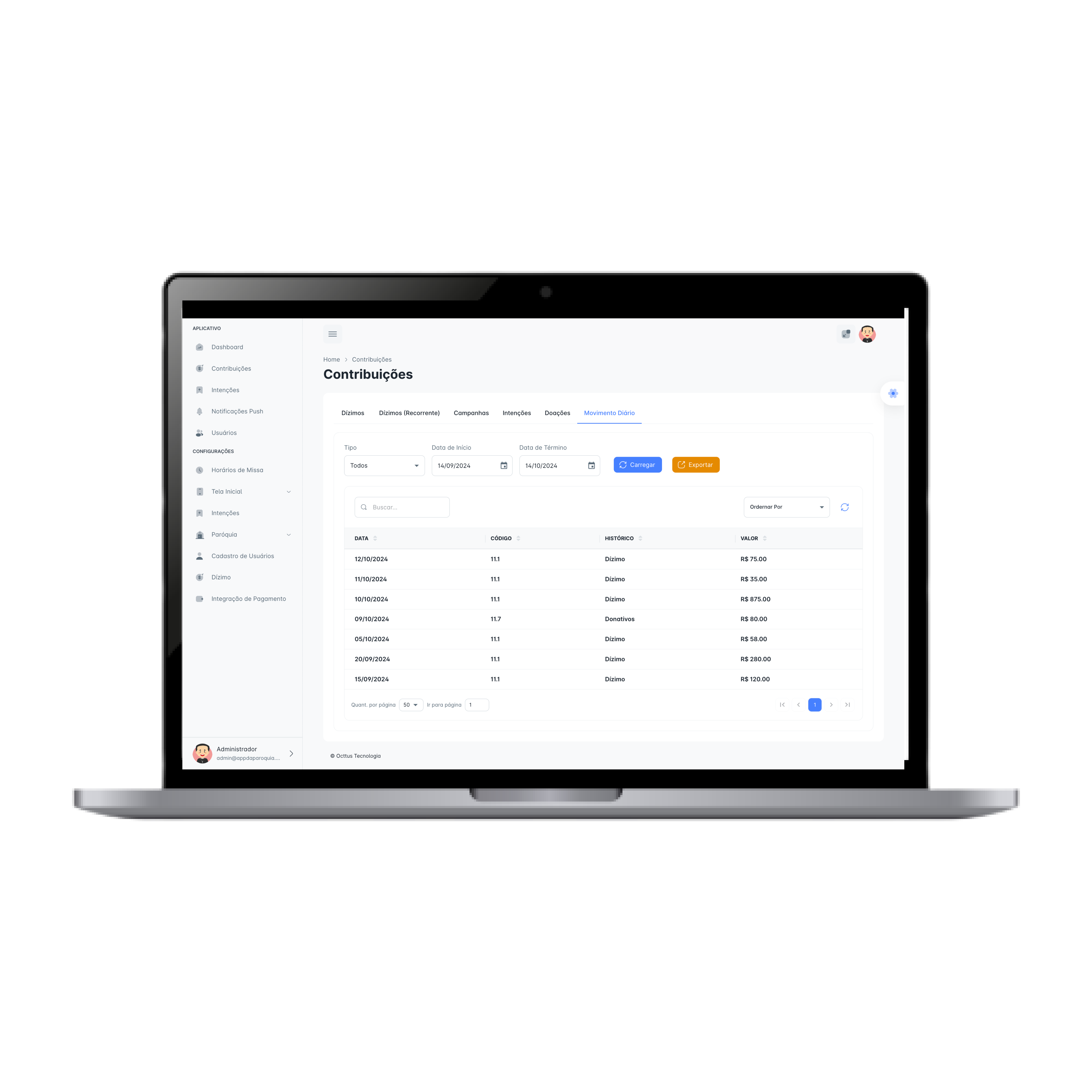 A dashboard administrativa permite que a paróquia tenha acesso detalhado às contribuições da comunidade, incluindo pagamentos de dízimos, campanhas beneficentes e doações. Os administradores podem gerar relatórios financeiros diários, acompanhar as movimentações financeiras e exportar listas de doações e intenções cadastradas pelos fiéis para controle e análise.