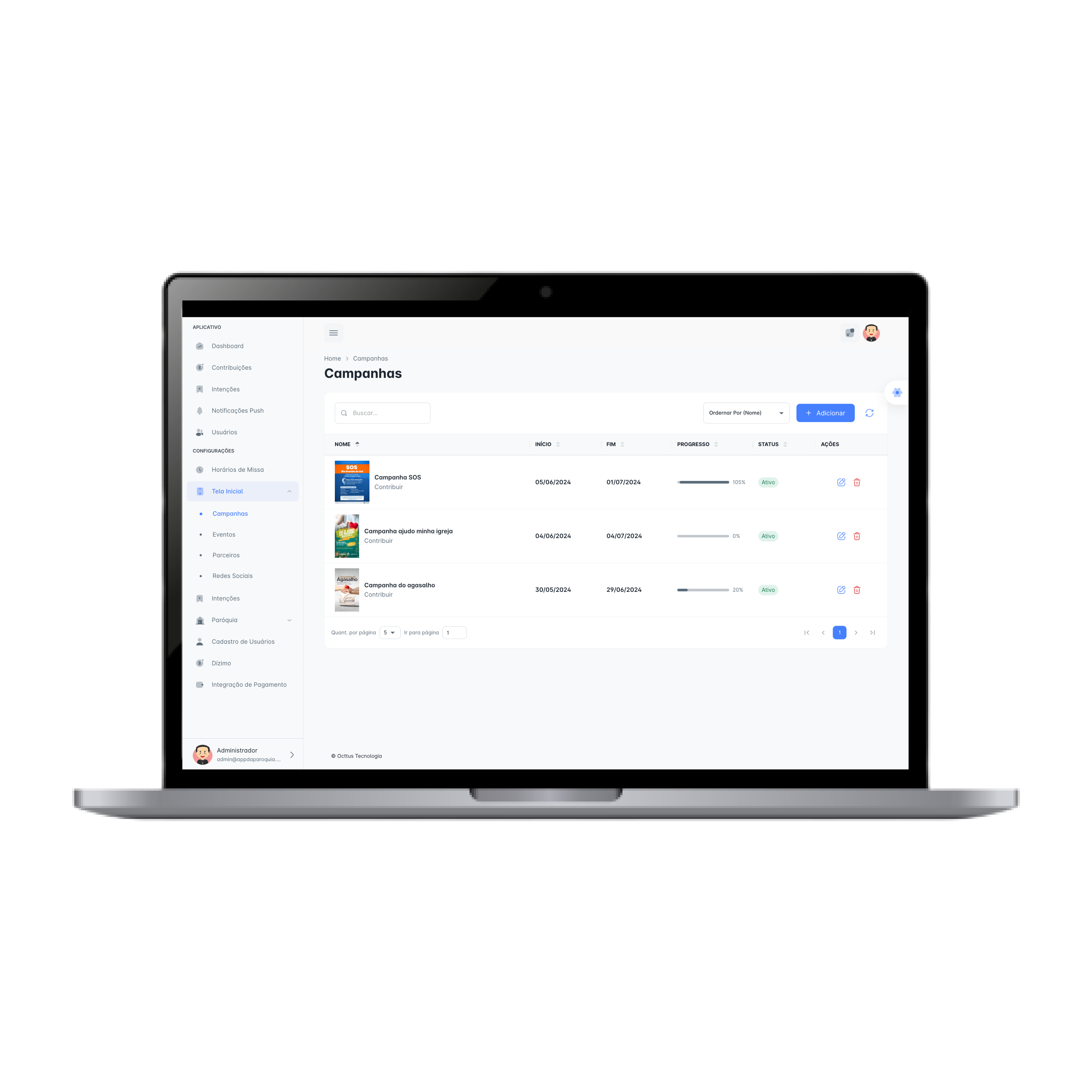 Através da dashboard, é possível cadastrar missas, campanhas beneficentes, eventos especiais da paróquia, e até mesmo gerenciar parcerias com patrocinadores. Essa funcionalidade facilita a organização e comunicação dos eventos com a comunidade, permitindo que todas as informações sejam centralizadas e acessíveis.